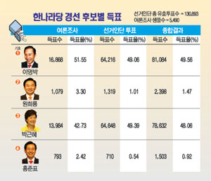 개표 집계결과 이 전 시장은 선거인단 투표에서는 박 전 대표와 치열한 경합끝에 432표 뒤졌으나, 일반국민 상대 여론조사에서 8.5% 포인트(표로 환산시 2천900여표) 가량 앞서 승리한 것으로 나타났다.