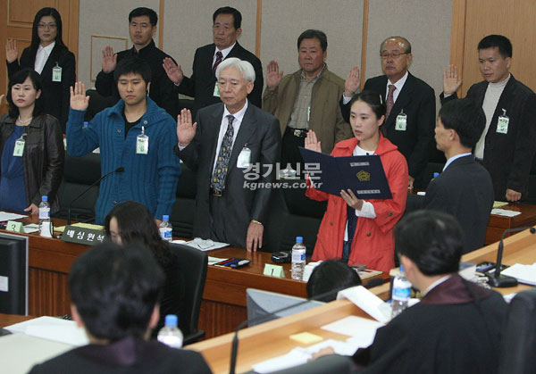 국민참여재판 시행을 2개월여 앞둔 29일 수원지법 110호 법정에서 열린 모의재판은 배심원으로 나선 시민들의 선서로 시작됐다. 이날 모의재판은 형사 중죄(重罪) 사건 피고인이 배심원의 판단을 받을 수 있게 ‘국민의 형사재판 참여에 관한 법률’이 제정되면서 내년 1월1일부터 시행되는 국민참여재판이 어떻게 진행되는 지 홍보하고 진행사항을 점검하기 위해 마련됐다.