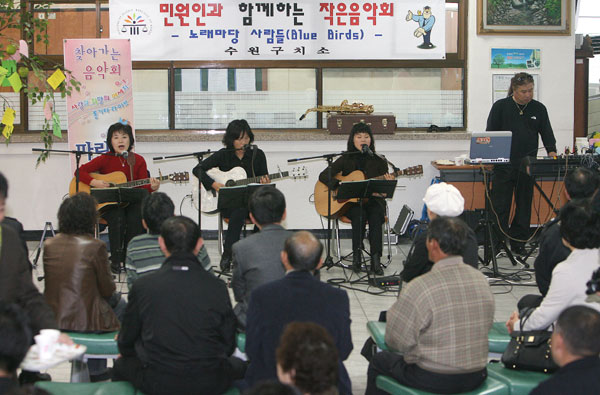 안양시 봉사단체로 등록돼 지역 사회에 많은 봉사활동을 하고 있는 ‘노래마당 사람들’의 포크송 공연으로 시작된 이날 음악회에서는 ‘폴링 인 러브’ 등 색소폰 연주도 함께 공연돼 1시간 동안 민원인들에게 잔잔한 감동을 주고 큰 박수를 받기도 했다.