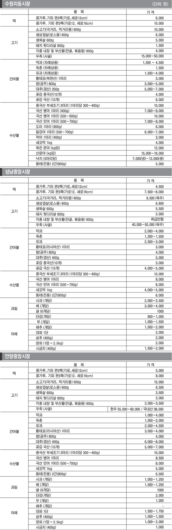 그렇다면 누구나 아는 대형마트와 재래시장 간의 가격비교가 아닌 재래시장 간의 가격비교에서는 누가 승리할까. 28일 수원 지동시장과 성남 중앙시장, 안양 중앙시장 등 경기지역 내 주요 재래시장 세 곳의 설 차례 품목 가격을 조사한 결과 각 재래시장 별, 품목별 가격에 차이를 보여 재래시장 별 주력품목은 따로 있는 것으로 나타났다.