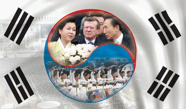이 대통령은 과거를 돌아보며 건국 60년의 역사에 대해 “산업화와 민주화를 동시에 이뤄낸 기적과 신화”로 평가한 뒤, 미래로 가는 길은 '선진화'라고 제시했다. 특히 선진화 원년을 선포하는 대목, 남북협력을 강조하는 대목, 대한민국을 성공의 기회가 보장되는 나라로 말하는 대목에서는 우뢰와 같은 박수가 이어졌다.