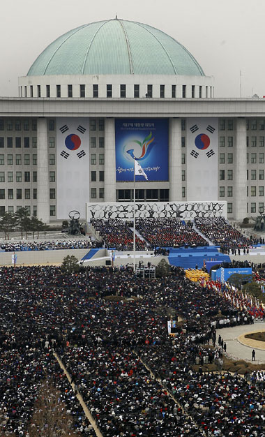 오전 11시. 제 17대 대통령 취임식 개식 선언이 이뤄지자 의원회관과 국회도서관 옥상에서 팡파르가 우렁차게 울려 퍼지면서 역사적인 취임식의 막이 올랐다. 단상에 오른 이명박대통령은 취임사에서 '선진화의 길, 다 함께 열어갑시다'고 강조하였다.