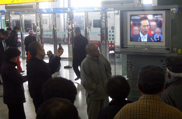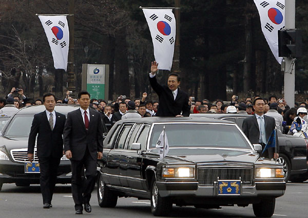노무현 대통령이 퇴장하자, 이명박대통령 내외는 입장할 때처럼 시민들과 일일이 악수를 하면서 중앙통로를 통해 국회 정문까지 걸어간 이 대통령은 손을 흔든 뒤 승용차에 탑승해 청와대로 향했다.