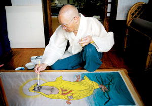 필자가 방문하던 날에도 일당스님은 그곳에서 마치 선정(禪定)에 들어간 것처럼 작업에 몰두하고 있었다. 노스님 화가가 그린 것이라고는 믿겨지지 않을 정도로 부드러우면서도 힘이 느껴지는 그림이었다. 팔십오 세의 나이임에도 불구하고 젊은이 못지않은 힘이 느껴졌고 그림을 그리는 데 전혀 무리가 없어 보였다.