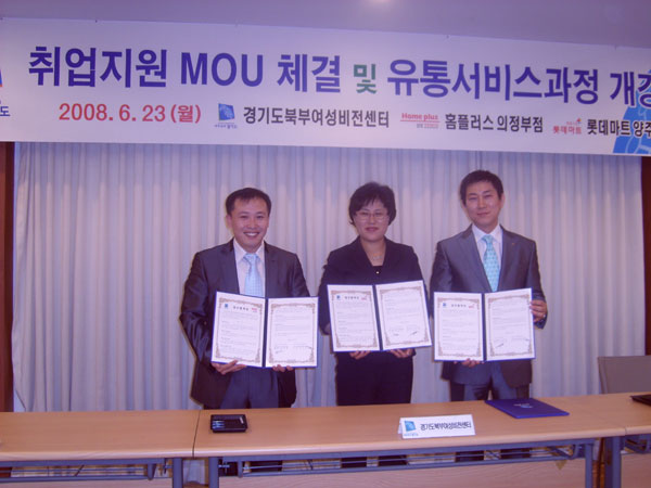 경기북부여성비전센터는 23일 북부지역 대형 유통업체인 홈플러스 의정부점·롯데마트 양주점과 우선취업을 위한 MOU(업무협약)을 체결했다.
