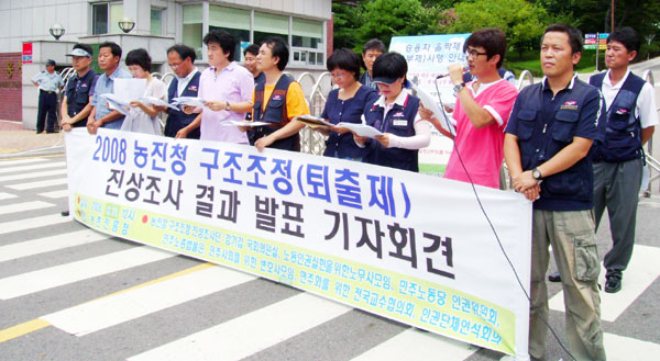 농촌진흥청(이하 농진청) 구조조정(퇴출제) 진상조사단은 11일 농진청 정문 앞에서 기자회견을 열고 퇴출제 철회를 요구하고 나섰다.