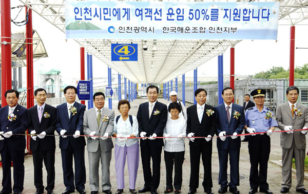 <속보>인천시는 전국 최초로 인천시민의 여객선 운임지원사업 시행(본지 8월 20일자 12면 보도)에 따라 1일 오후 연안부두 여객터미널 대합실에서 안상수 인천시장을 비롯해 고집섭 시의회의장, 조윤길 옹진군수, 박상은 국회의원과 지역 주민 등이 참석한 가운데 기념식을 가졌다.