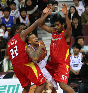 11일 안양실내체육관에서 벌어진 프로농구 안양 KT&G와 대구 오리온스의 경기에서 KT&G 챈들러(가운데)가 오리온스 마이클(왼쪽)과 크리스의 이중 수비를 뚫고 있다. /연합뉴스