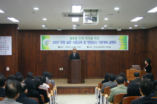 시흥교육청(교육장 이상덕)은 12일 관내 유·초·중·고등학교 교장, 행정실장, 교육과정 운영 주무교사 230여명을 대상으로 2009 ‘희망 실현 시흥교육’기본 계획 설명회를 개최했다.