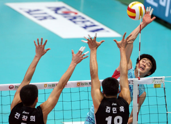 대한항공은 1세트 초반 신협상무의 오픈공격과 속공에 속수무책으로 당하고 외국인 선수 칼라의 공격이 상대팀 블로킹에 걸리는 범실이 이어지면서 9-13까지 끌려갔다.