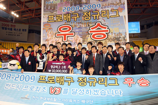 또 천안에서 열린 현대캐피탈과 신협상무의 경기에서는 현대캐피칼이 3-0(25-19 25-18 25-22)로 가볍게 승리하며 28승8패로 3년 만에 프로배구 남자부 정규리그 1위를 차지했다.