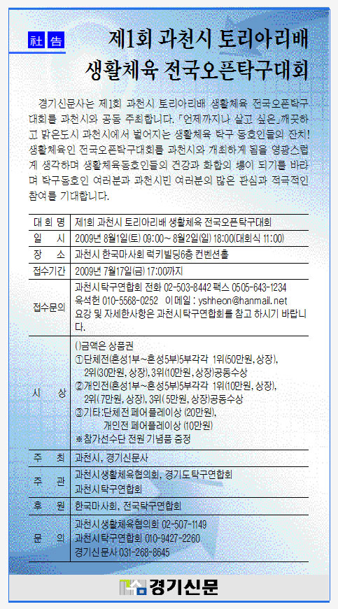 제1회 과천시 토리아리배 생활체육 전국오픈탁구대회