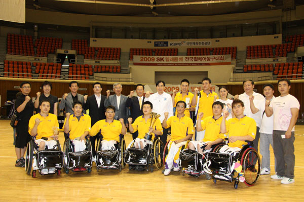 1일 경기도장애인체육회에 따르면 지난달 28일부터 4일동안 서울 올림픽펜싱경기장에서 열린 2009 SK텔레콤배 전국휠체어농구대회에서 수원을 연고로한 무궁화전자가 1부리그 우승을 차지했다.