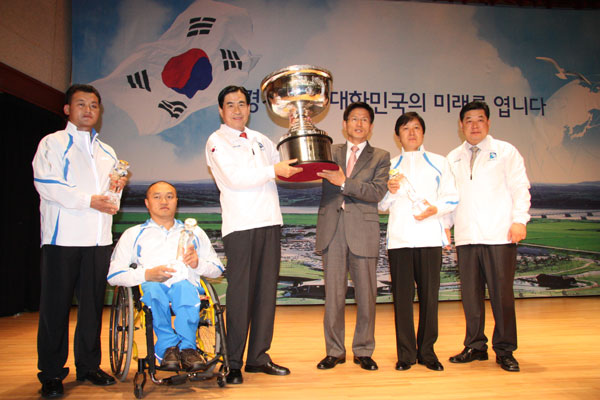 경기도장애인체육회는 지난 1일 오전 경기도 제2청사에서 제29회 전국장애인체육대회 종합우승 4연패 달성 우승기 및 우승배 봉납식을 가졌다.