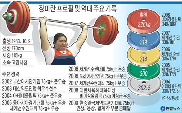 지난 9월 일본에서 실시한 3주간의 전지훈련 중 지난해 올림픽 용상에서 자신이 세운 세계기록(186㎏)보다 4㎏이나 많은 190㎏을 성공했던 장미란은 지난달 열린 전국체전에서 자신의 최고 기록(326㎏)에 16㎏ 모자라는 합계 310㎏을 들어올리며 컨디션을 조절했다.