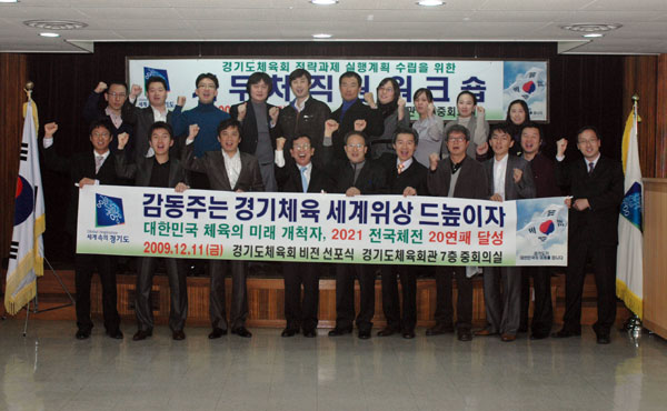 도체육회는 지난 10일부터 11일까지 이틀동안 경기도체육회관 7층 중회의실에서 홍광표 도체육회 사무처장과 공석복 운영부장 및 사무처 직원과 한국산업관계 연구원 등 20여명이 참석한 가운데 사무처 직원 워크숍과 비전 선포식을 갖고 ‘감동주는 경기체육 세계위상 드높이자’는 비전을 발표했다.