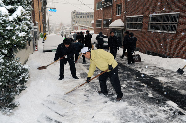지난 4일 새벽부터 내린 폭설을 치우기 위해 시 산하 직원이 총동원돼 민·관·군이 한마음 한뜻으로 제설작업에 총력을 기울이고 있다.