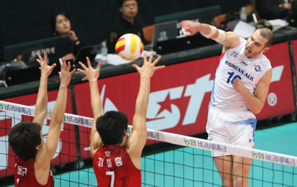 2세트에도 23-23 동점을 이룬 대한항공은 LIG손보의 해결사 김요한에게 오픈 공격을 허용하고 김철홍의 블로킹으로 세트포인트를 내주며 승부를 원점으로 돌렸다.