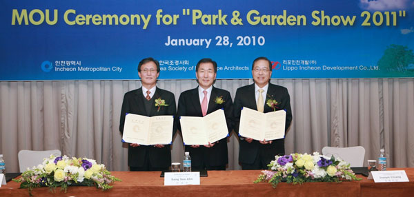 인천시와 한국조경사회 및 리포인천개발은 28일 2011 대한민국조경전람회를 개최에 대해 상호 협력키로 하는 MOU를 체결했다.
