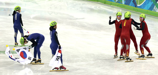 그러나 경기 뒤 심판진은 레이스 도중 한국 선수가 중국 선수를 밀쳤다고 판정해 실격 결정을 내렸다.