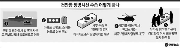 신원이 확인된 시신은 3구씩 헬기를 이용해 임시 안치소가 마련된 경기도 평택 해군 2함대사령부로 옮겨진다.