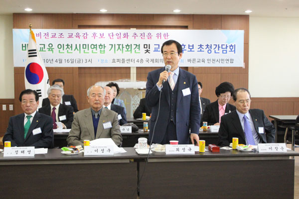 바른교육인천시민연합은 지난 16일 오후 효피플센터 국제회의실에서 비전교조 성향 교육감 후보 6명이 참여한 가운데 ‘기자간담회 및 인천시 교육감 후보 초청 간담회’를 갖고 후보 단일화 방안을 발표했다.