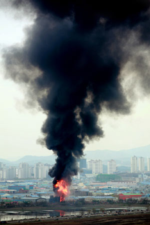 인근 업체 직원 박종일(42)씨는 “건물 2층에서 근무하고 있는데 꽝하는 소리가 들려 창문으로 내다 보니 S산업에서 화염이 치솟고 이후 ‘펑’하는 소리가 여러 차례 들렸다”고 말했다.