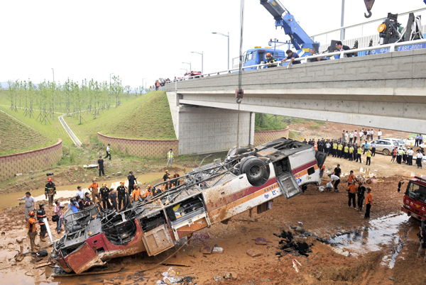굴러 떨어진 버스는 환전히 뒤집어진 채로 형체를 알라볼 수 없을 정도로 심하게 부서지고 버스주변에는 사이드미러와 좌석시트를 비롯 각종 차량 부속품이 어지럽게 흩어져 있었고 사망자와 부상자들이 흘린 피가 곳곳에 고여 있는 등 참혹한 모습이었다.