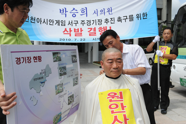 인천에서는 지난 7일과 19일 서구 주민들이 아시안게임 주경기장 건설 계획 유지를 요구하는 집회를 열고 21일에는 서구 구의원 등이 주경기장 예정지부터 인천시청까지 삼보일배 행진을 벌였다.