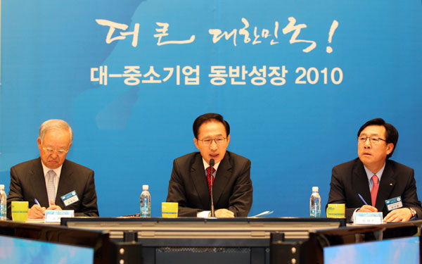 이 대통령은 이날 오전 청와대에서 대기업과 중소기업 CEO와 경제단체장, 경제전문가, 당·정·청 관련 인사들이 참석한 가운데 열린 국민경제대책회의에서 이러한 대기업·중소기업 동반성장 전략의 최종 지향점을 제시했다.