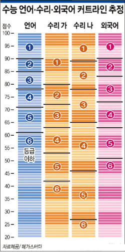 21일 학원가에서 가채점 결과를 분석한 자료에 따르면 고난도·신유형 문제가 많았던 수리 가형의 1등급 커트라인(원점수 기준)은 78~80점으로 작년(89점)보다 9~11점이나 떨어지고 언어영역은 2~4점, 외국어영역도 1~3점 정도 각각 하락할 것으로 점쳐졌다.