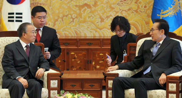 이명박 대통령이 긴급 방한한 다이빙궈(戴秉國) 국무위원을 28일 접견해 북한의 연평도 포격 도발에 대한 양국의 입장과 대응책을 조율했다.