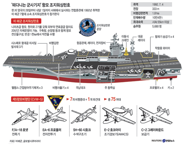▲ 28일부터 내달 1일까지 서해에서 최고수준의 한미연합훈련이 실시된다. 이번 훈련은 북한의 군사적 도발에 대응한 일련의 계획된 훈련으로, 항공기의 실무장 폭격과 해상사격 등 최대규모로 진행된다. 사진은 이번 연합훈련에 참가하는 미국 항공모함 조지 워싱턴호(9만7천t급). /연합뉴스