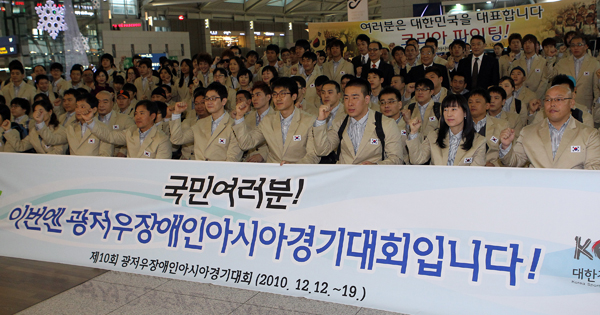 한국 선수단은 8일 오전 인천국제공항에서 윤석용 대한장애인체육회 회장과 선수, 가족 등 총 300여 명이 참석한 가운데 출영 행사를 열고 대회가 열리는 중국 광저우로 출국했다.