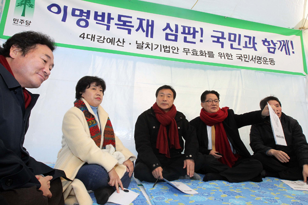 그는 이어 지역 시민사회 원로들과 가진 ‘천막 간담회’에서 “야당 대표가 길거리에 천막을 치고 앉아 정부와 대통령을 향해 항의하고 국민에게 도와달라고 하는 것은 결코 아름다운 모습이 아니다”며 “날치기를 정부여당 탓으로만 돌리고 싶지 않다. 함께 책임지고 속죄한다는 마음을 갖고 있다”고 말했다.