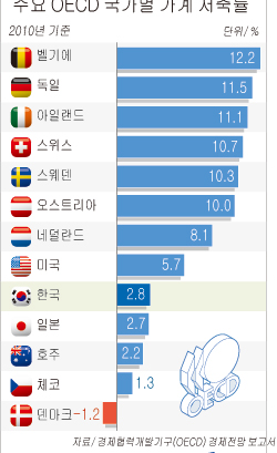 7일 경제협력개발기구(OECD)의 경제전망 보고서에 따르면 지난해 우리나라의 가계 저축률(저축액/가처분소득)은 2.8%로, 저축률 자료가 제시된 20개 회원국의 평균 저축률 6.1%에 크게 못미쳤다.