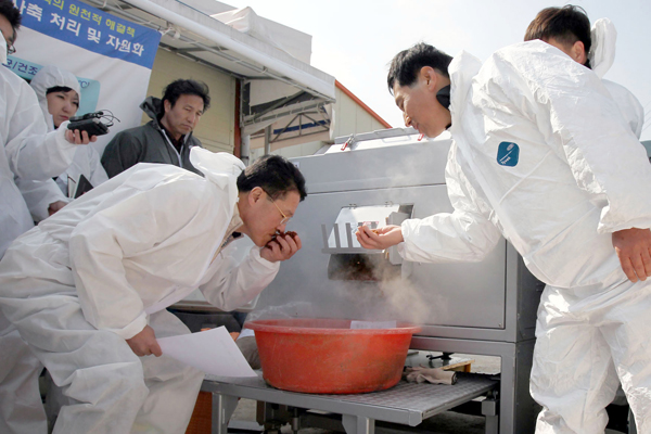 정 최고위원은 살처분 가축이나 침출수 등 전염성이 있는 유기물을 170도 이상 의 고온멸균 방식으로 처리해 유기질 퇴비화하는 방안을 선보였다.