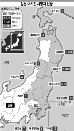 경찰청에 따르면 이날 오전 9시 30분 현재 사망자는 미야기, 이와테현 등 전국 12개 광역자치단체에서 3천676명, 실종자는 6개 광역자치단체에서 7천845명으로 합계 1만1천521으로 집계되는 등 시간이 갈수록 늘고 있다. 쓰나미 경보가 해제된 이후 마을을 삼켰던 물이 빠져나가면서 재해지역에서는 본격적인 사체 수습 작업이 이어졌다.