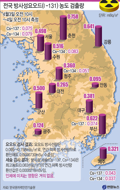 한편 한국원자력안전기술원(KINS)은 이날 전국 12개 지방측정소에서 공기 중 방사성 물질을 검사한 결과, 모든 지역에서 미량의 방사성 요오드(I-131)가 검출됐다고 밝혔다.