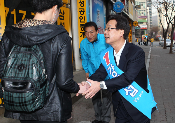 그는 이날 오전 7시 감색 양복에 어깨띠를 두르고 출근길 주민들이 가장 많은 지역인 금곡동 미금역을 첫 선거운동 지역으로 찾았다. 그의 선거운동은 매일 오전 7시부터 오후 10시까지 강행군으로 짜여져 있다.