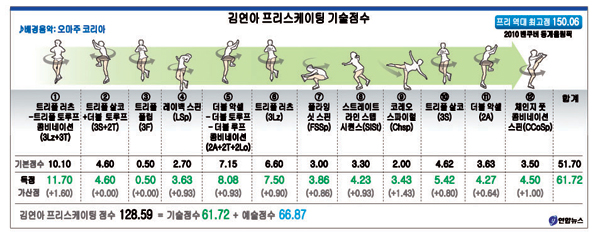 김연아는 그러나 이어진 트리플 살코-더블 토루프 콤비네이션 점프(기본점 5.6점)에서 후반 점프를 1회전으로 처리해 기본점이 4.6점으로 깎였고, 트리플 플립(기본점 5.3점)까지 1회전으로 처리해 기본점인 0.5점밖에 얻지 못했다.