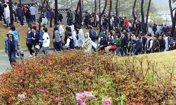 30일 오전 수원화성행궁 광장에서 열린 ‘2011 가족과 함께… 친구와 함께… 수원화성돌기’ 행사에서 참가한 학생들이 꽃길을 따라 줄지어 걷고 있다./특별취재반