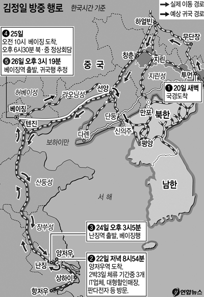 김 위원장은 20일 오전 7시 전후에 특별열차 편으로 투먼(圖們)에 도착해 무단장(牧丹江)-하얼빈(哈爾濱)-창춘(長春)-양저우(揚州)-난징(南京)-베이징(北京)을 방문했다.