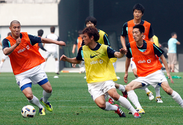 역삼각형 형태의 중원에는 이용래(수원)-김정우(상주)가 중앙 미드필더 ‘듀오’로 나서고 공격의 시발점인 수비형 미드필더 자리에는 기성용(셀틱)이 선다.