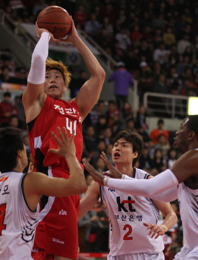 빈약한 외곽 공격에 전반에 두 팀의 합친 점수가 40점 대에 그칠 정도로 힘든 경기를 펼친 가운데 먼저 외곽포가 터진 것은 KGC였다.