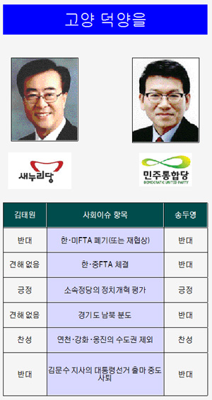 ▷주요 공약 및 당선 후 추진과제 : 행신역세권 발전방안 수립, 평택(서울)~문산고속도로 주민불편 해소 후 추진 및 대책 미흡시 사업 전면재검토 촉구, 주민이 즐길 수 있는 수변문화공간 확대, 개발제한구역·군사보호구역 등 토지규제개혁 추진, 주민중심의 능곡뉴타운 개발지원, 대곡역환승센터 성공적 개발지원, 국회 바로세우기, 영유아 무료예방접종 확대, 재래시장 등 영세상권 보호를 위한 카드수수료 인하, SSM골목상권 진입에 따른 자영업자 보호대책 마련