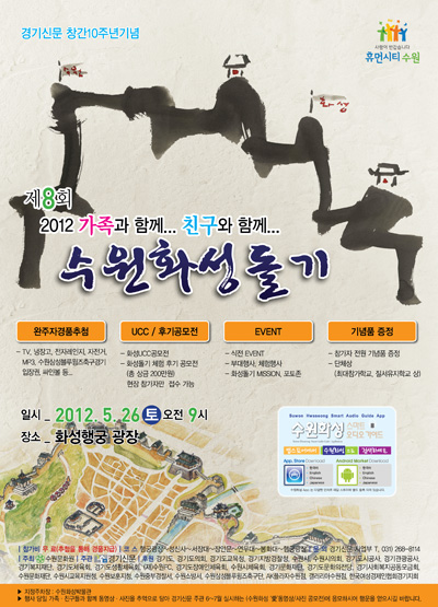 창간 10주년을 맞은 경기신문이 지역 문화창달을 위해 오는 5월 26일(토) “제8회 가족과 함께, 친구와 함께 2012 수원화성돌기” 행사를 개최합니다.