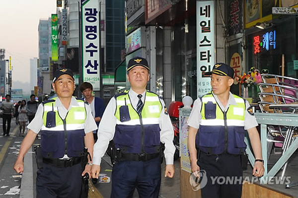 (수원=연합뉴스) 강경량 경기지방경찰청장이 26일 오후 파출소 경찰관들과 함께 수원시 팔달구 인계동 일대를 도보순찰하고 있다.