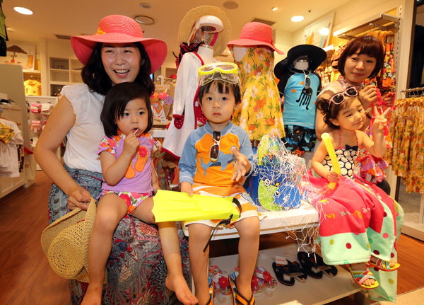 서울 소공동 롯데백화점 본점에서 29일 올여름을 겨냥한 아동수영복과 비치웨어를 선보이고 있다. 올 아동 수영복의 유행 트렌드는 원색적인 컬러와 프린트를 이용해 귀여움과 깜찍함을 극대화해서 사랑스럽게 표현한 것이 특징이다.