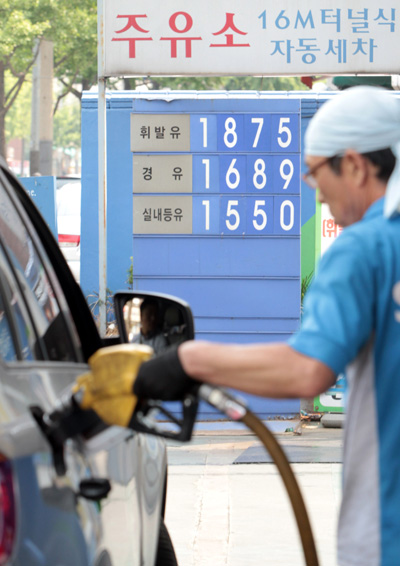 전국 주유소의 ℓ당 휘발유 가격이 두달째 하락세를 지속하고 있는 18일 서울 시내의 한 주유소에서 차량들이 주유를 하고 있다. 유가정보서비스 사이트 오피넷(http://www.opinet.co.kr)에 따르면 18일 현재 전국 평균 ℓ당 휘발유 가격은 1천967.45원, 경유가격은 1천774.93원으로 전날보다 각각 1.37원, 1.14원 떨어졌고 밝혔다.